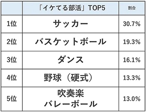 2位は「バスケットボール」(19.3%)、以下「ダンス」(16.1%)、「野球(硬式)」(13.3%)、「吹奏楽」「バレーボール」(いずれも13.0%)が続いた。