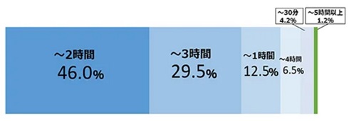 部活に入っている人に平日の平均活動時間を聞くと、最も多かったのは「1〜2時間」で46.0%。以下「2〜3時間」(29.5%)、「30分〜1時間」(12.5%)、「3〜4時間」(6.5%)が続いた。