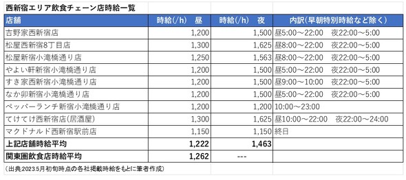 大商圏の店舗は売り上げが高く見込めるため、休業はおろか、時短すらしたくないのが本音です。やっと新型コロナが5類に移行し、商売としてはこれからという時にこれでは経営者や店長は心配で仕方がないでしょう。なぜこのような状況になっているのでしょうか。考えられるのは「時給が低くて人が集まらない」です。そこで、周辺にある飲食チェーン各店の時給を調べてみました。