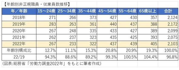 一方、55〜64歳、65歳以上の非正規雇用者は増加しています。特に65歳以上は19年よりも17万人増えています。55歳以上は正規雇用者数も増加しています。