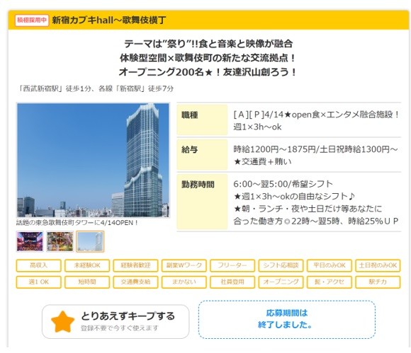 時給は吉野家とそう変わらず極端に高いわけではありません。時間も夜から朝までの営業ですが、週1回3時間からOKで、新店であり話題性もあります。そして何といっても「オープニングスタッフで200人の仲間ができる」とあります。吉野家は「時給良くて、近くて、融通がきく」とアルバイト採用ページでうたっていますが、新宿カブキhallと比較すると、魅力が伝わりづらい感は否めません。