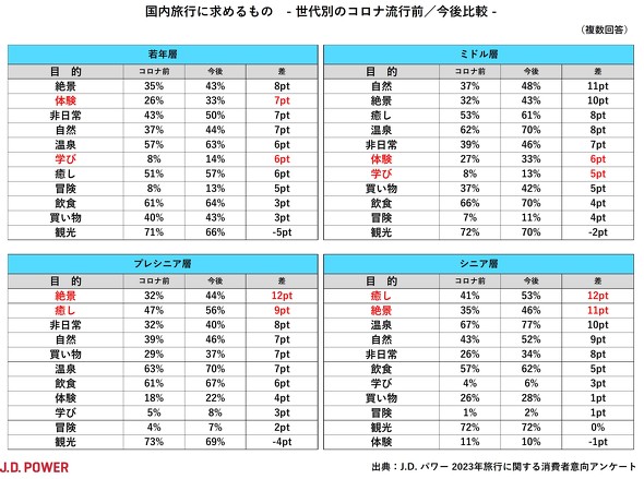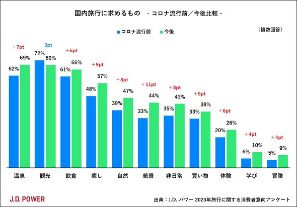 今後、国内旅行に求めるものを聞くと、1位は「温泉」と「観光」が69%で並んだ。コロナ前と比較すると、温泉は7ポイント増加したが、観光は3ポイント減少した。2位以下は「飲食」(66%)、「癒し」(57%)、「自然」(47%)と続く。コロナ前から最も回答率が伸びたのは「絶景」(44%)で、11ポイント増加した。
