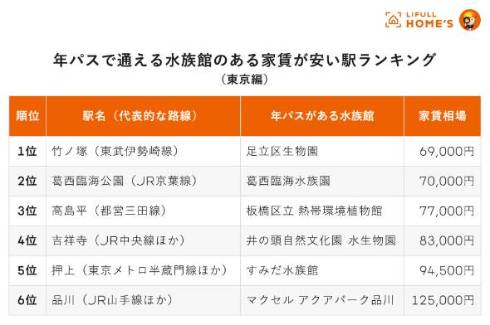 不動産・住宅情報サービスを運営するLIFULL(東京都千代田区)は、東京都内の「年パスで通える水族館のある家賃が安い駅ランキング」を発表した。その結果、「足立区生物園」に近い「竹ノ塚駅(東武伊勢崎線)」(家賃相場:6万9000円)がトップを獲得した。