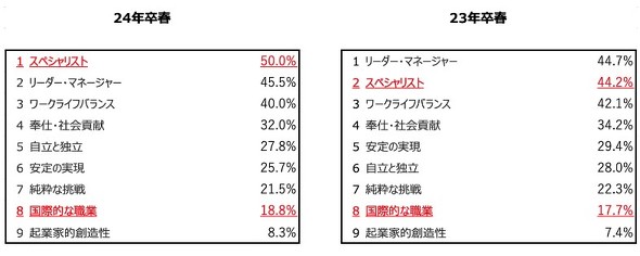 目指すキャリアゴールを聞いたところ、11年の調査開始以降初めて「スペシャリスト」が1位を獲得した。50.0%が回答した。以下、「リーダー・マネジャー」(45.5%)、「ワークライフバランス」(40.0%)と続く。