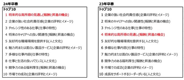 企業を選択する際に重視する項目でも、調査を開始して以降初めて「将来的な高所得の見通し(報酬と昇進の機会)」が1位を獲得した。前年1位の「企業の強い社会的責任感(企業の評判とイメージ)」は2位だった。以下、「チャレンジ性のある仕事(仕事の特性)」「将来のキャリアへの良い関連性(報酬と昇進の機会)」「友好的な職場環境を提供する(人と文化)」が続いた。