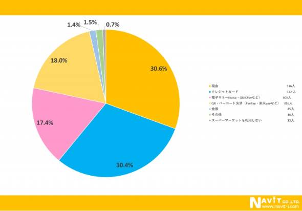 スーパーでの支払い方法については、「現金」(30.6%)と「クレジットカード」(30.4%)が目立った。次いで「QR・バーコード決済」(18.0%)、「電子マネー」(17.4%)。キャッシュレス決済だけを合わせると65.8%で、約3分の2の割合を占めた。