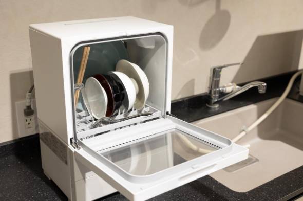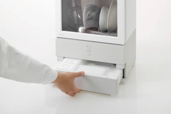 庫内容積もスタンダードな食器6点+カトラリーと、単身世帯に使い勝手のいいサイズ感。初めて食洗機を使う人でも使いやすいよう、機能はシンプルに抑えた。手洗いよりキレイになる高温高圧水流、洗いと同時に除菌ができるストリーム除菌洗浄機能、手洗いの約8分の1の高い節水性の3点が特徴だ。