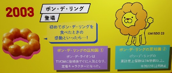 ポン・デ・リングはその後、あずき、キーマカレー、アロエヨーグルトなどさまざまな味を展開してきた。発売アイテム数は236アイテムで、累計販売数は35億個を記録している(23年5月末時点)。また、海外でもポン・デ・リングは人気で、23年5月にオープンしたシンガポールの店舗でも最も支持されているという。「ポン・デ・ライオン」は、ミスド初のオリジナルキャラクターで、関連グッズも多く展開している。ポン・デ・リングはそれほど存在感のある商品だ。