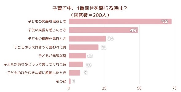 1位の「子どもの笑顔を見るとき」は、73人が回答した。答えた人からは「目が合っただけで声を出して笑っている姿を見て、この子の親になれて良かったなと思う」「どんなに疲れていたりつらいことがあっても、子どもの笑顔を見ただけで悩みが吹っ飛ぶくらい幸せな気持ちになる」といったコメントがあった。