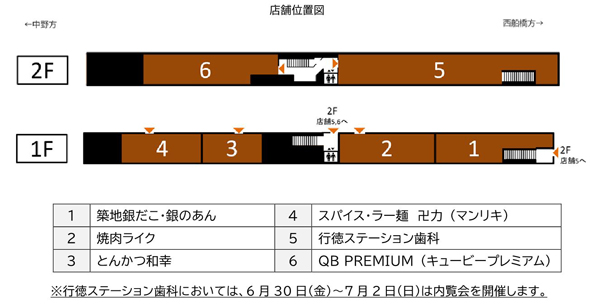 新たに入店するのは、築地銀だこ・銀のあん、焼肉ライク、とんかつ和幸、スパイス・ラー麺 卍力(マンリキ)、行徳ステーション歯科、QB PREMIUM(キュービープレミアム)の6店舗。施設全体の敷地面積は312.42平米、延床面積は510.47平米となる。