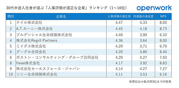 1位は企業向けにデジタルマーケティングの支援を行う「ナイル」。自動車産業のデジタル化にも参入し、カーリースを提供するなど急成長中のベンチャー企業です。2位は米国に拠点を置くコンサルティング会社の日本法人「A.T.カーニー」、3位に「プルデンシャル生命保険」が入りました。