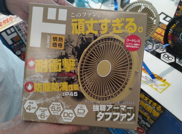 アウトドア需要などを見込んだ「強靭アーマータフファン」(5478円)は、「耐衝撃」「防塵防滴性能」を売りにしている。衝撃を吸収するラバーボディーが、米国国防総省の物資調達基準「MIL規格」をクリアしているという。高さ1.22メートルから製品を26方向で合板(ワラント材)に落としても、機器が正常に動作するという。