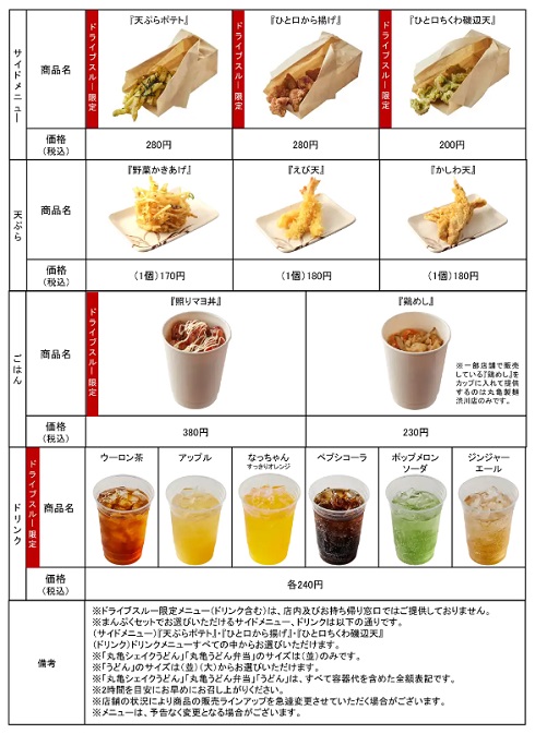 サイドメニューでは「天ぷらポテト」「ひと口から揚げ」「ひと口ちくわ磯辺天」がドライブスルー限定となっている。