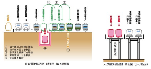 複線で分岐させようにも、西側にはみ出せば民有地の買収が必要になるし、東側は東海道新幹線の線路が横たわっている。大胆な考え方として、東海道線を高架化して東海道新幹線をまたぐような複線分岐をつくる案は……さすがに途方もない。鉄オタの妄想が過ぎるだろう。