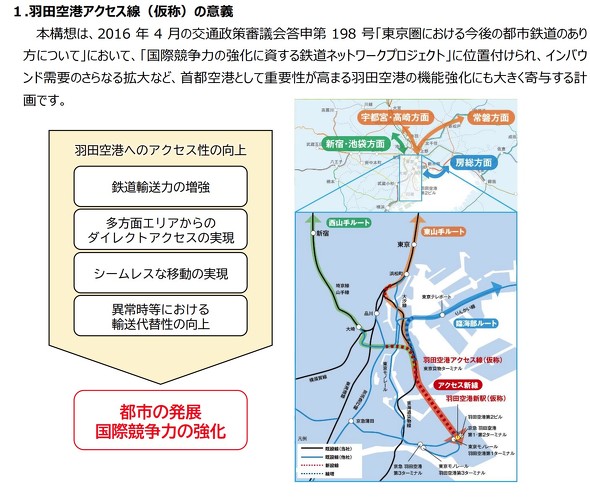 当面は4往復というけれども、単線部分と東海道線の運行本数を考えると、これ以上の増発は難しそうだ。しかし将来のりんかい線乗り入れで、新宿から中央線方面、新木場から京葉線方面の直通が可能だ。羽田アクセス線が通る東京貨物ターミナルはりんかい線の車両基地があり、すぐに線路をつなげられる。というより、もともとりんかい線は京葉貨物線の一部であり、赤字国鉄が手放した区間を東京都が引き取って旅客化した経緯がある。