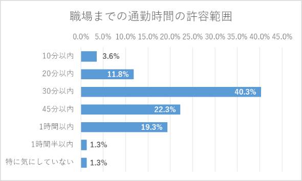 居住エリアを決める際には通勤時間も重要な要素。自宅から職場までの通勤時間の許容範囲について尋ねると、最も多かったのが「30分以内」で40.3%だった。「45分以内」が22.3%、「1時間以内」が19.3%と続いた。