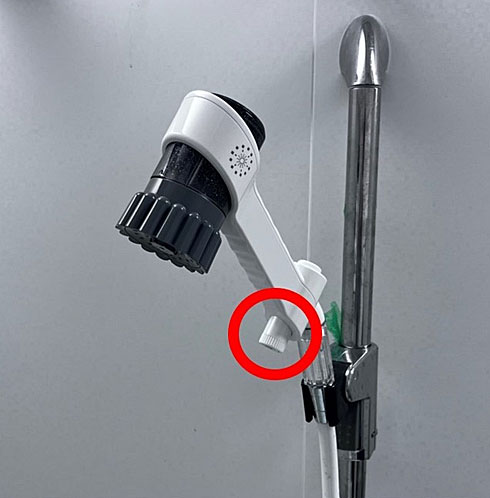 本体にある一時止水ボタンをグッと押し込むと水が止まる。操作感はやや重めで最後まで押し込まないと止水できないが、途中で押し込むのをやめると水量が減るので、押し込み具合で水量が調整できるようになっている。