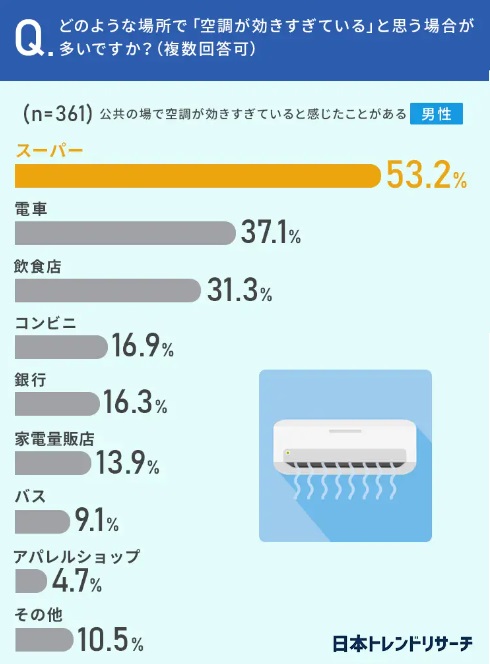 どのような場所で「空調が効きすぎている」と思う場合が多いかと聞くと、トップは「スーパー」(66.3%)。次いで「電車」(40.0%)、「飲食店」(39.3%)、「コンビニ」(13.2%)、「銀行」(12.4%)が続いた。男女別にみると、男性は「家電量販店」、女性は「バス」の割合が高くなっていた。