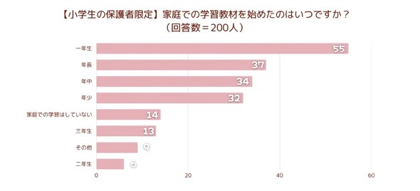 小学生の子どもがいる家庭では、いつごろから学習教材を使い始めたのだろうか――。ARINA(仙台市)が運営する教育メディア「おうち教材の森」が、小学生の保護者を対象に調査を実施したところ、最も多かった回答は「小学1年生」(55人)だった。