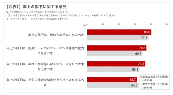 年上の部下について上司はどんな考えを持っているのだろうか。特に多かった回答は、「年上の部下は、若い人の手本になるべき」(80.8%)、「年上の部下は、所属チームのはフォーマンス発揮の主力になるべき」(74.6%)、「年上の部下は、あれこれ指導しなくても、自走して成果を出すべき」(73.2%)だった。