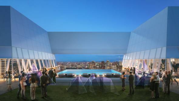 この施設では、46階のメインホールを中心に、新たな体験やコンテンツなどを発信するプレゼンテーションやパフォーマンスの場を提供。ドーム型天井を備えたギャラリーなどもあり、多様な表現方法に対応する。49階には、屋外空間としてスカイガーデンとインフィニティプールを設置した。飲食店も4店舗オープンする。