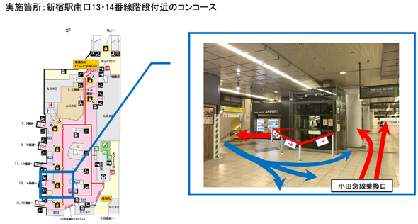 新宿駅では、朝の通勤時間帯(7時10分〜10時10分)において、人々の安全でスムーズな通行を目指している。13・14番線から各方面へ乗り換える利用者と小田急線乗り換え口からの利用者が交錯しないように、エレベーターを中心に反時計回りに一方通行となる実証実験を行った。