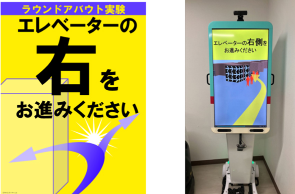 期間中は係員を配置し、誘導を実施。あわせて実施箇所周辺でポスターを掲示およびサイネージへの動画配信をし、ラウンドアバウトに誘導した。エレベーター周辺ではパーテーションを設置し、通行方向を表示した。