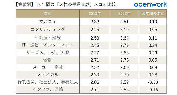 13年時点で唯一の2点台だった「人材の長期育成」スコアは、10年間で0.95点上昇し、22年には3.19点に改善。スコアの変化を業種別でみると、コンサルティング業界の上昇幅が最大となりました。