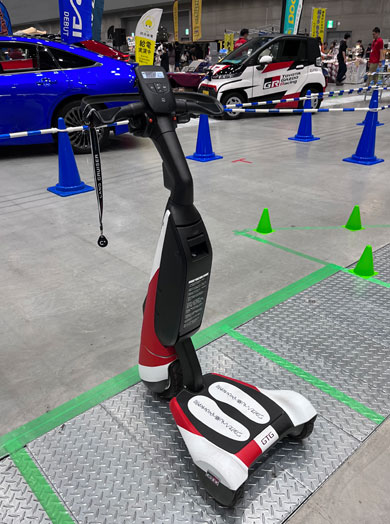 トヨタが発売したC+walk T。連続走行距離は16kmなので、歩行の代わりとしてのモビリティであり、これだけで移動の大半を賄うことは想定していない。障害物検知などの安全装備もあって、価格は36.3万円〜とまだまだ誰もが手軽に手に入れるものではなさそうだ。このGRのカラーリングは群馬トヨタグループがイベント用にあつらえたもので、オプションとして用意されているものではない一方、立ち乗りタイプは自立しているので安定感が高く思えたが、実際に試乗してみると小回りする際に車体が傾かないので、むしろ不安定な印象もあった。急転舵した際には自動的に減速するが、歩道走行可の電動キックボードよりも低速での移動に適したモビリティと言えそうだ。