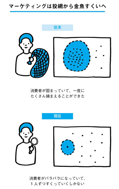 そして、たくさんのヒットを狙うなら、当然マーケティングも分散すべきです。これまで魚群として集まっていたものが、いまは金魚のようにそれぞれが法則性もなく自由に動いています。投網で一気に捕まえるのではなく、いろいろな場所で1匹ずつすくわなければいけません。