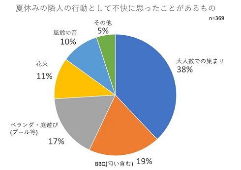 夏休み期間に絞って調査を行ったところ、隣人の行動として不快に思ったことがあるものとして最も多かったのは「大人数の集まり」(38%)。以下「BBQ(におい含む)」(19%)、「ベランダ・庭遊び(プールなど)」(17%)、「花火」(11%)、「風鈴の音」(10%)が続いた。