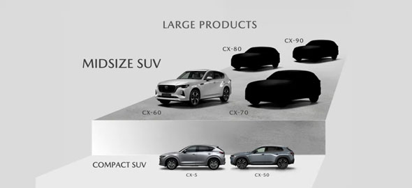 原則論としては、「MAZDA3」およびその展開モデルである「CX-30」「MX-30」。それに北米向けの「CX-50」がスモールプラットフォーム群を構成し、「CX-60」「CX-70」「CX-80」「CX-90」がラージプラットフォーム群を形成する。ちなみに「MAZDA2」と「CX-3」は「CX-5」同様第6世代の生き残りである。