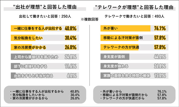 テレワークを希望する人の理由は「外が暑い」(76.1%)が最多で、次いで「移動による汗対策が面倒」「テレワークの方が快適」が同率(57.8%)の結果に。「出社が理想」と回答した人の理由は、1位「一緒に仕事をするメンバーが出社するから」(40.8%)、2位「気分転換をしたいから」(30.4%)、3位「テレワークだと冷房費がかかるから」(26.0%)だった。