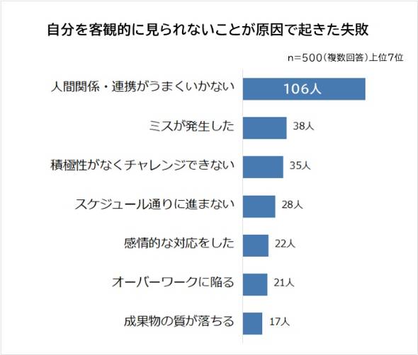 自分を客観的に見れないことが原因でおきた仕事の失敗は「人間関係・連携がうまくいかない」(106人)がトップ。次いで「ミスが発生した」(38人)、「積極性がなくチャレンジできない」(35人)、「スケジュール通りに進まない」(28人)、「感情的な対応をした」(22人)だった。