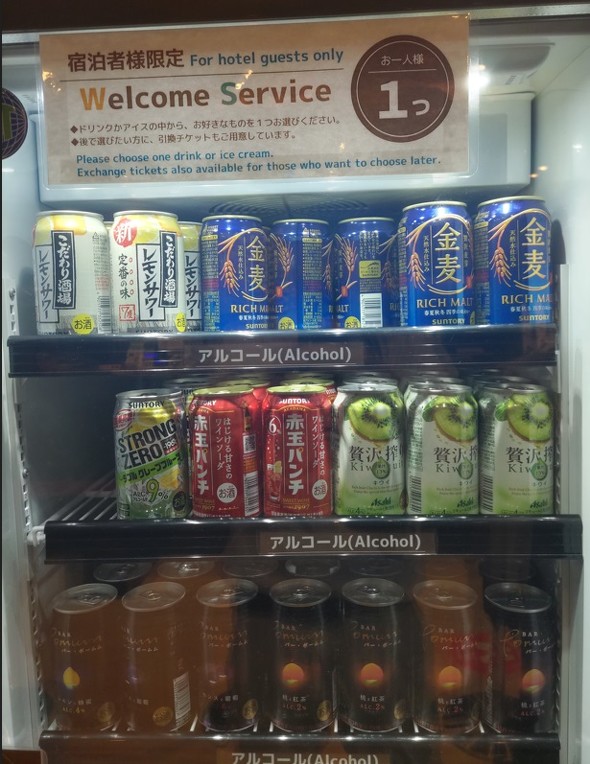 店舗1階には宿泊者限定のウエルカムサービスがあり、複数の冷蔵・冷凍ケースには、チューハイ、ハイボール、ソフトドリンク、フルーツ牛乳、アイスクリームなどがぎっしりと詰まっている。ハーゲンダッツのアイスクリームや、500ミリリットルのアルコールもあった。