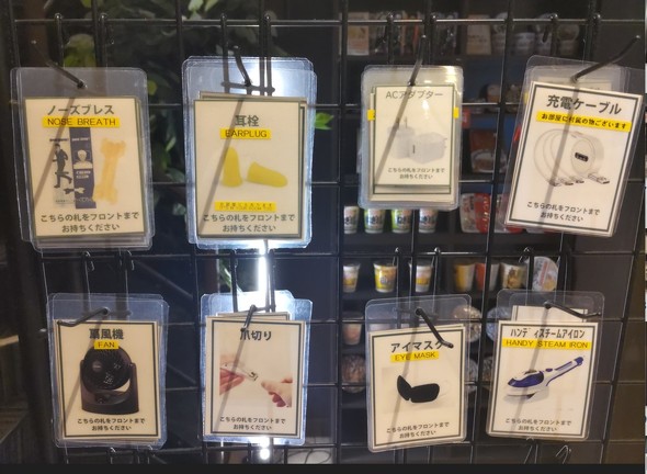 無料で貸し出すアイテムとして、耳栓、いびき防止のノーズブレス、爪切り、アイマスク、靴乾燥機、スタンドライト、コンタクト保存液、毛玉クリーナー、カールドライヤー、手鏡、ライター、HDMIケーブル、靴磨きセット、老眼鏡などを用意。入口付近には、レンタル可能なアイテムが分かる札がずらっと並んでおり、利用者は札を手に取ってフロントに渡す仕組みになっている。