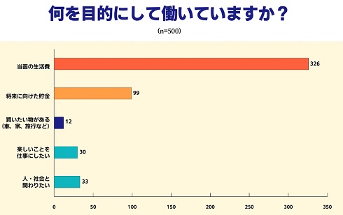 働く目的については「当面の生活費」(65.2%)がダントツ。以下「将来に向けた預貯金」(19.8%)、「人・社会と関わりたい」(6.6%)、「楽しいことを仕事にしたい」(6.0%)が続いた。「将来的な預貯金や資産形成、自己実現を考える以前に、直近の生活に不安がある労働者が多い」(同社)