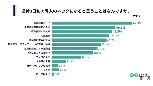 一体何がネックとなっているのだろうか。週休3日制の導入のネックを聞くと「部署間の不公平」が62.4%、「出勤日の勤務時間の増加」が49.6%、「従業員間の不公平」が46.8%と続いた。