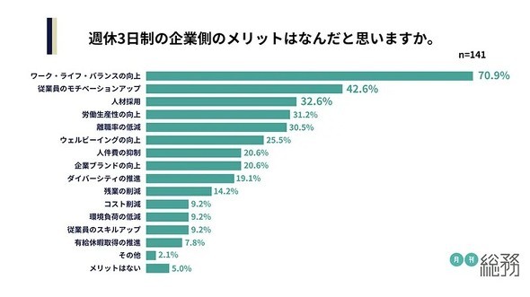 企業として捉える週休3日制のメリットは「ワーク・ライフ・バランスの向上」が70.9%、「従業員のモチベーションアップ」が42.6%、「人材採用」が32.6%と続いた。