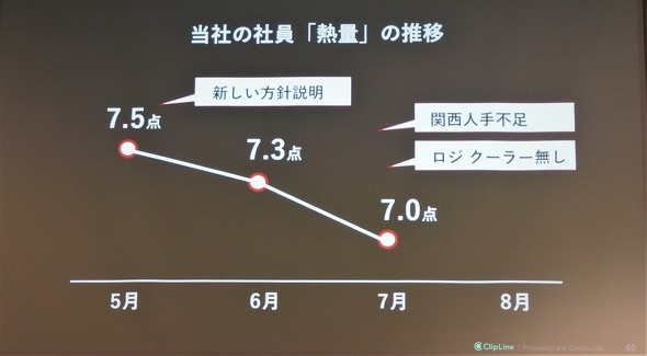 越智氏はこの現状を「5月に社内に向けて今後の方針と戦略を語りました。その直後は高い状態だったモチベーションが、現在下がってきてしまっています。原因を探ったところ、ロジスティクスセンターで空調の故障があり、夏なのに暑い思いをしていたことや、関西の店舗で人手不足が深刻であることなどが見えてきました」と分析。
