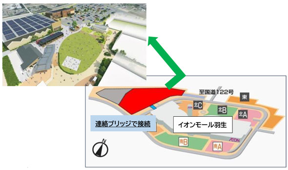 nONIWAのオープンを機に、これまで平面駐車場として使用していた建物西側エリアに公園を設置。北関東初出店の大型アウトドア専門店「アルペンアウトドアーズ」や関東最大級の「モンベル」直営店などの外部棟、芝生、噴水のある広場を配置する。