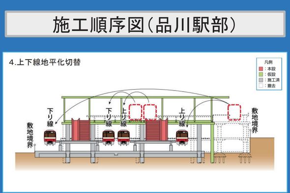 京急品川駅を地上に降ろす手順として、まずJR山手線の留置線があった部分に同じ高さで仮のプラットホームを建設する。次に、現在の複線とプラットホームを維持しつつ、構造物を撤去して仮設構造に切り替えていく。この状態で地平プラットホーム2本とその両脇に線路を敷設する。地平設備が完成したところで線路を切り替えて地平プラットホームの使用を開始。引き続き旧プラットホーム部分にコンコース(連絡通路)をつくる。