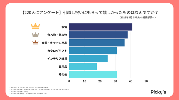おすすめ比較サイト「Picky's」を運営するrentry(長野市)が実施した調査によると、もらってうれしかった引っ越し祝い3位は「食器・キッチン用品」、2位は「食べ物・飲み物」だった。