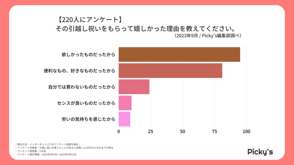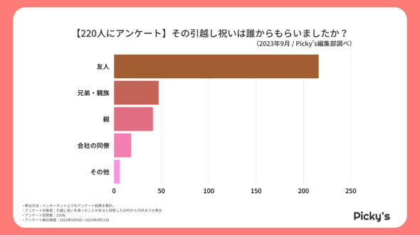 調査は、引っ越し祝いをもらったことがあると回答した20〜70代男女を対象にインターネットで実施した。期間は9月4〜11日で、有効回答数は220人。