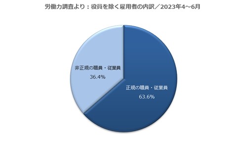 総務省の労働力調査によると、23年4〜6月平均で非正規雇用者が占める割合は36%で2090万人、正規雇用者は64%で3652万人です。