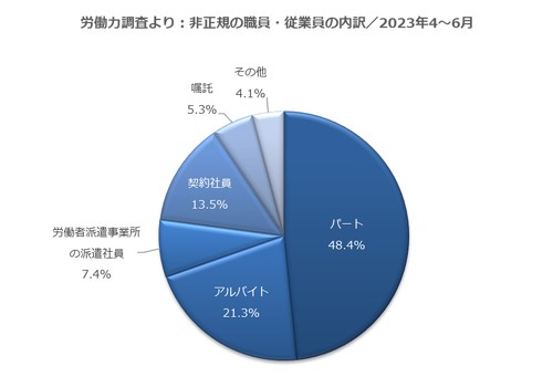 さらに、非正規雇用者全体を100%とすると、内訳はパートが48%、アルバイトが21%と、パートとアルバイトだけで約7割を占めています。続けて比率が高い順に、契約社員14%、派遣社員7%、嘱託5%です。グラフにすると以下のようになります。