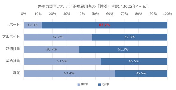 まず、特徴的なのがパート層。87%が女性でかつ有配偶者が75%を占めています。そこから、主な属性がいわゆる主婦層であることが見えてきます。