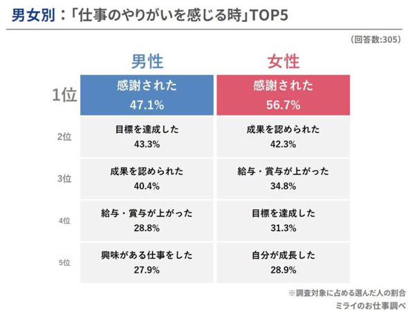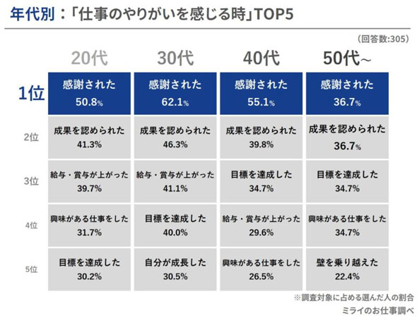 1位の「感謝されたとき」については、男女別および20〜50代以上の各世代別でも1位となった。回答者からは「機器の販売で導入のサポートまで行ったところ『時短や効率化がはかれた』と、その会社の方全員に感謝されたときはとてもやりがいを感じた」(27歳男性会社員)、「困難などがあっても『ありがとう』の一言で報われる」(58歳男性)などの声が上がっている。