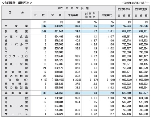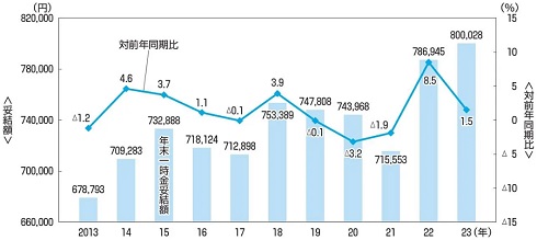 ここ数年の冬のボーナス(各年9月時点の集計)を見ると、新型コロナの影響で20年に74万3968円(前年同期比3.2%減)、21年に71万5553円(同1.9%減)と減少したものの、22年にはマイナスの影響が薄らぎ78万6945円(同8.5%増)と大幅に増加。23年も80万28円(同1.5%増)と2年連続のプラスとなった。