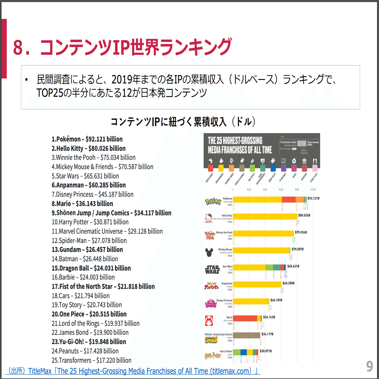 コンテンツIP世界ランキング。日本のマンガ・アニメ発IPが上位を独占している(出所:TitleMax「The 25 Higest-Grossing Media Franchises of All Time」)マンガやアニメは一度読んだり見たりして終わりではなく、その世界観やキャラクターの認知・好意を知財(IP)として活用し、さまざまなコンテンツや事業に展開されます。映画、グッズ、ゲーム、イベント、テーマパーク、企業とのコラボレーションなど、多種多様です。